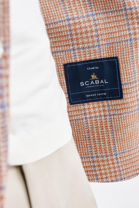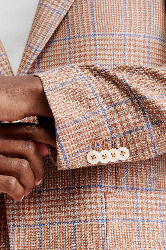 The Medium Orange Wool & Linen Soho Jacket Riviera Trend blends the relaxed elegance of the Italian coast with the contemporary refinement of the Soho silhouette. Its linen-rich textured weave showcases confident checks and bold houndstooth motifs in oceanic blues, lifted by vibrant summer accents. Finished with a relaxed notch lapel and meticulously crafted in our own workshop, it delivers an effortless balance of modern style, comfort, and elevated sophistication.