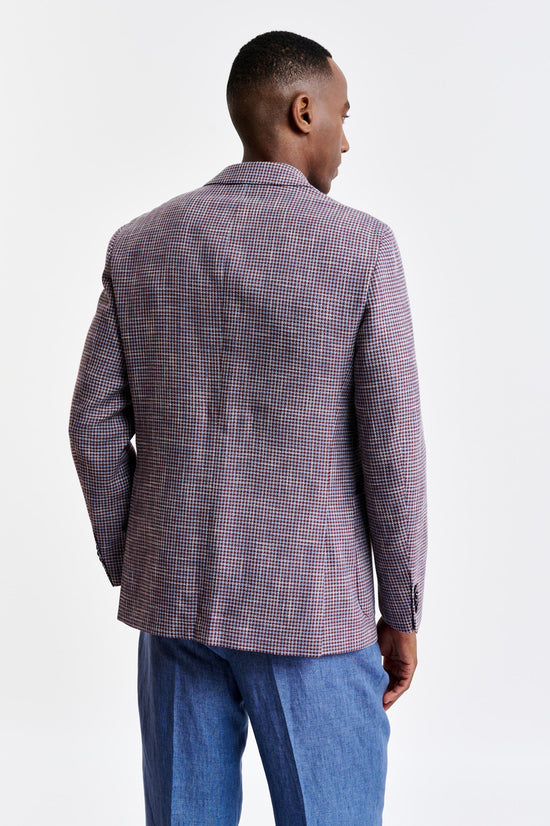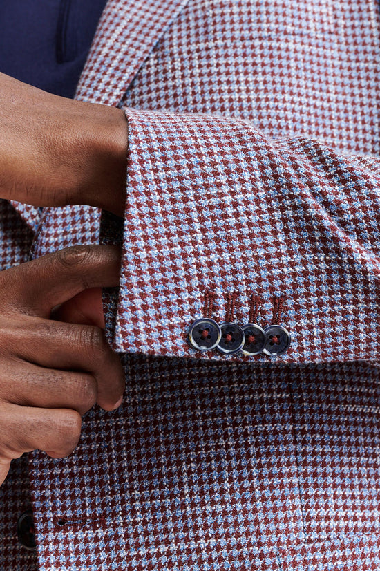 The Medium Red Wool & Cotton Kenton Jacket Riviera Trend brings the relaxed sophistication of the Italian coast to a contemporary, ultra-lightweight silhouette. Its textured, linen-rich fabric pairs confident checks with bold houndstooth designs, enriched by a palette of oceanic blues and vibrant summer accents for a modern take on classic patterns.
