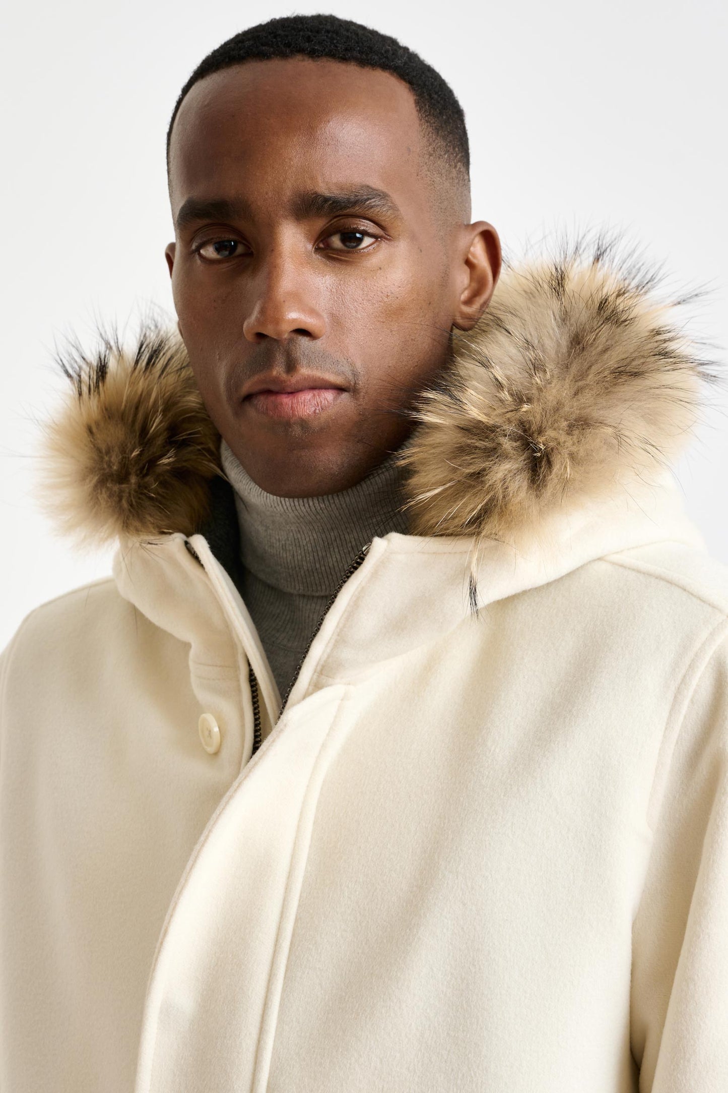 Der beige Woll-Bedford-Parka Zeus ist ein Muss für die kalten Temperaturen. Die Konstruktion aus 100 % Wolle bietet Schutz vor kalten Temperaturen und verleiht Ihnen gleichzeitig den Stil und die Passform, die nur ein Mantel bieten kann