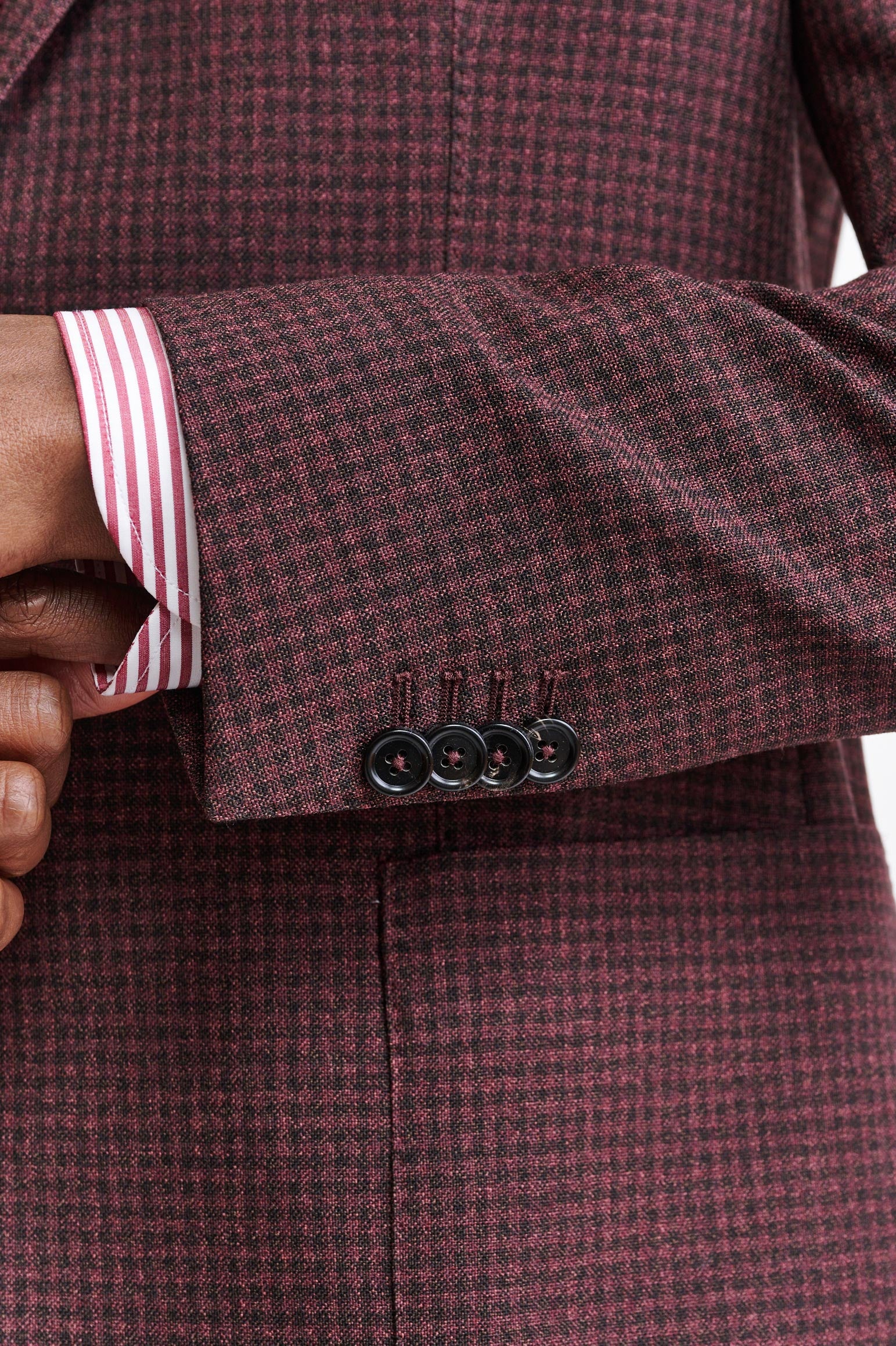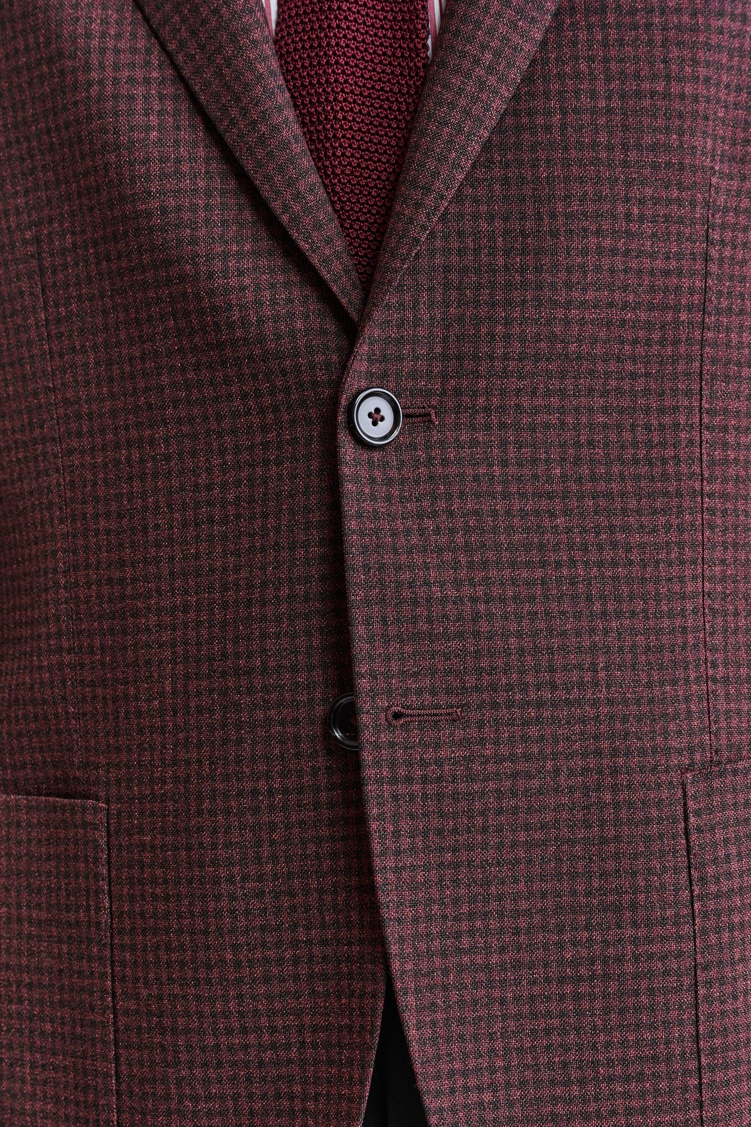 Die Dunkelrote Kenton-Jacke aus 100 % Wolle Jazz vereint die entspannte Eleganz der italienischen Küste mit einer zeitgemäßen, ultraleichten Silhouette. Der strukturierte, leinenreiche Stoff kombiniert selbstbewusste Karos mit auffälligen Hahnentrittmustern, die durch eine Palette aus ozeanischen Blautönen und lebhaften Sommerakzenten bereichert werden und klassische Muster modern interpretieren.