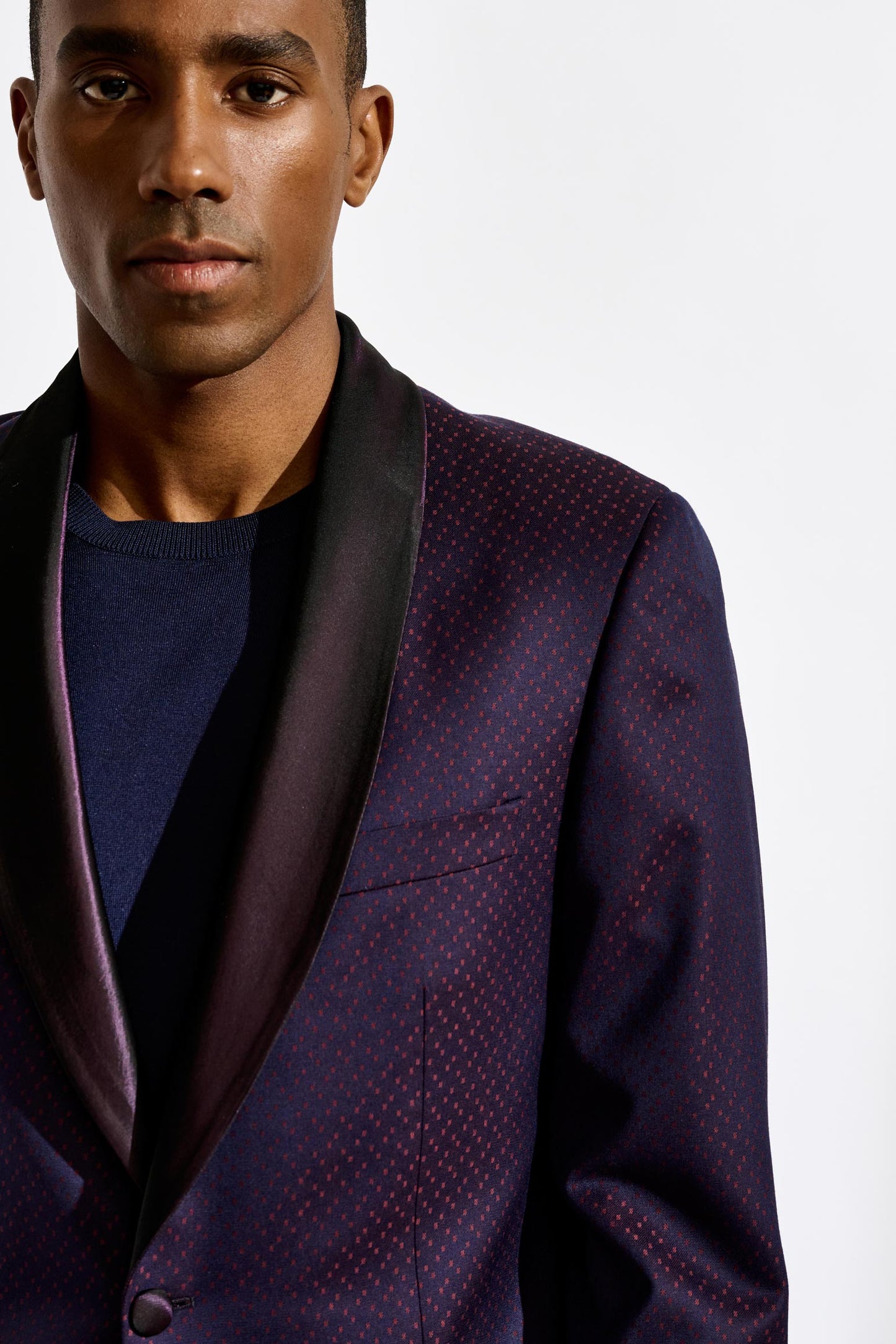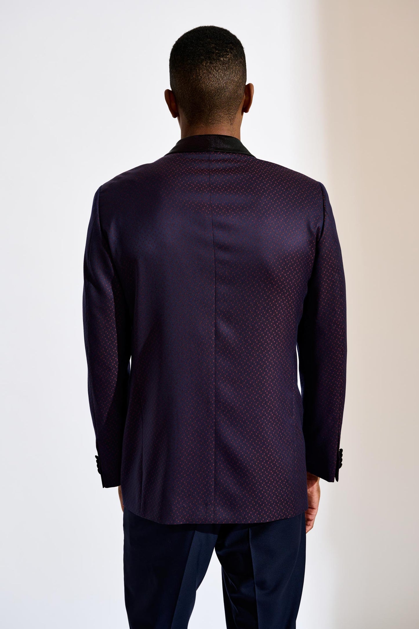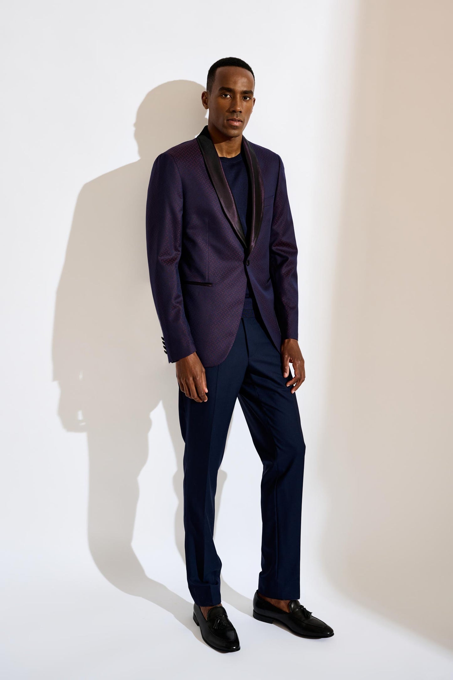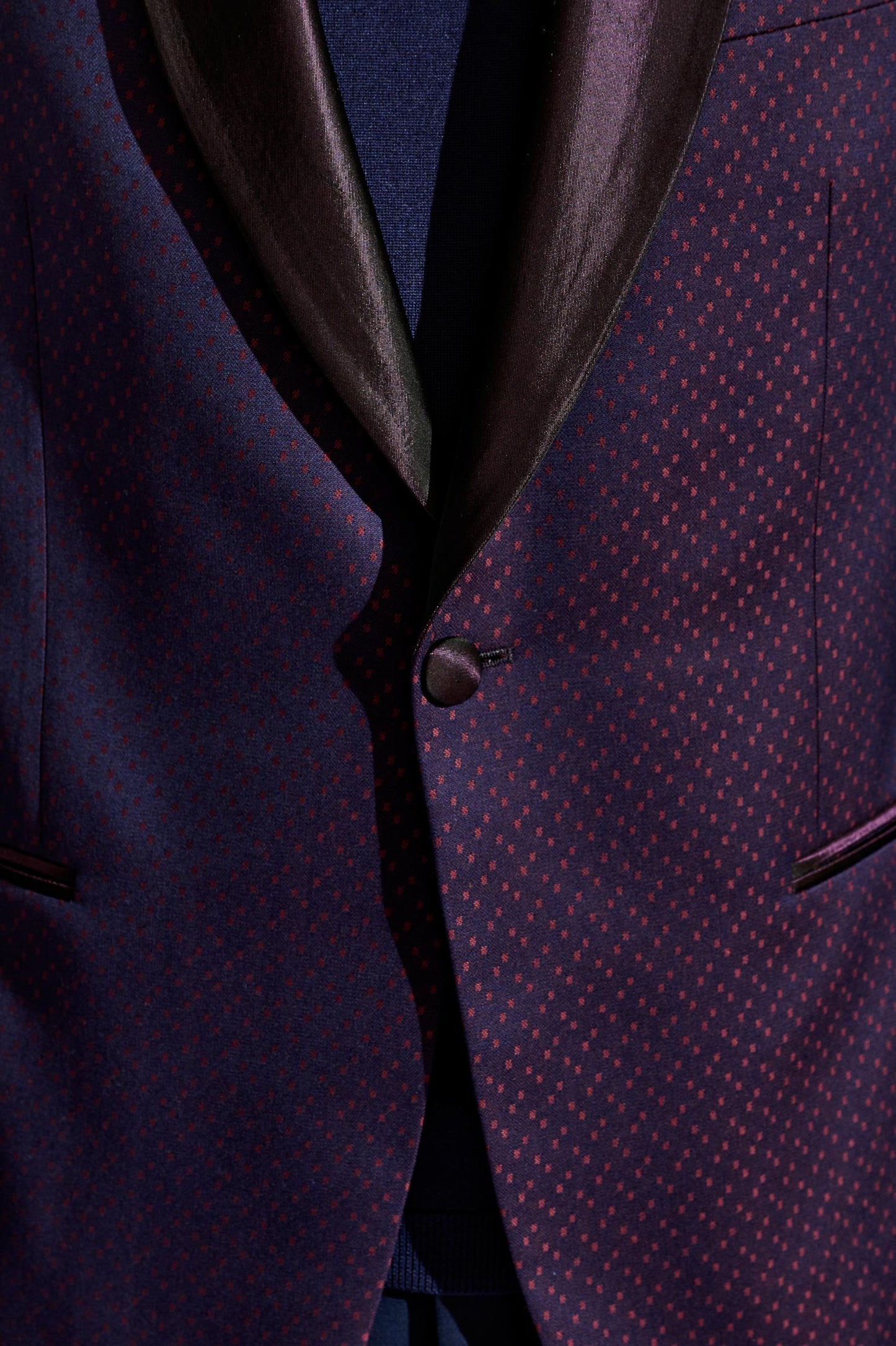 Inspiriert durch das charakteristische Rote Geböude in Lettland, reproduziert das Design das zuföllige Muster der Fenster. Die satten Farben und der sanfte Glanz des Stoffes haben uns dazu inspiriert, einen Smoking mit Schalkragen und passenden Revers aus changierendem Satin zu kreieren, der ein modernes Gefühl vermittelt. Die Jacke wurde mit dem ikonischen Scabal Dali Lining in passendem Burgunderrot gefüttert.