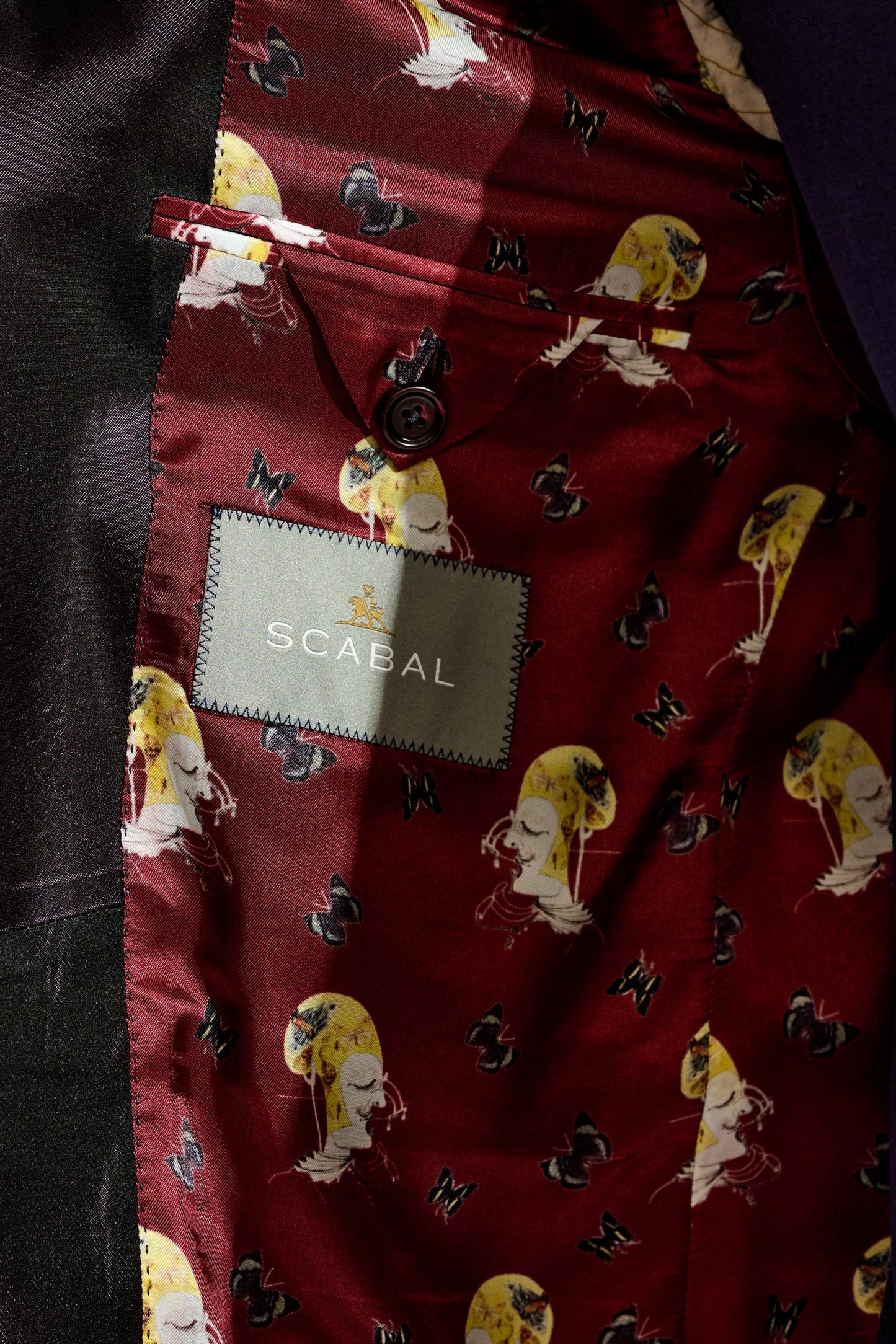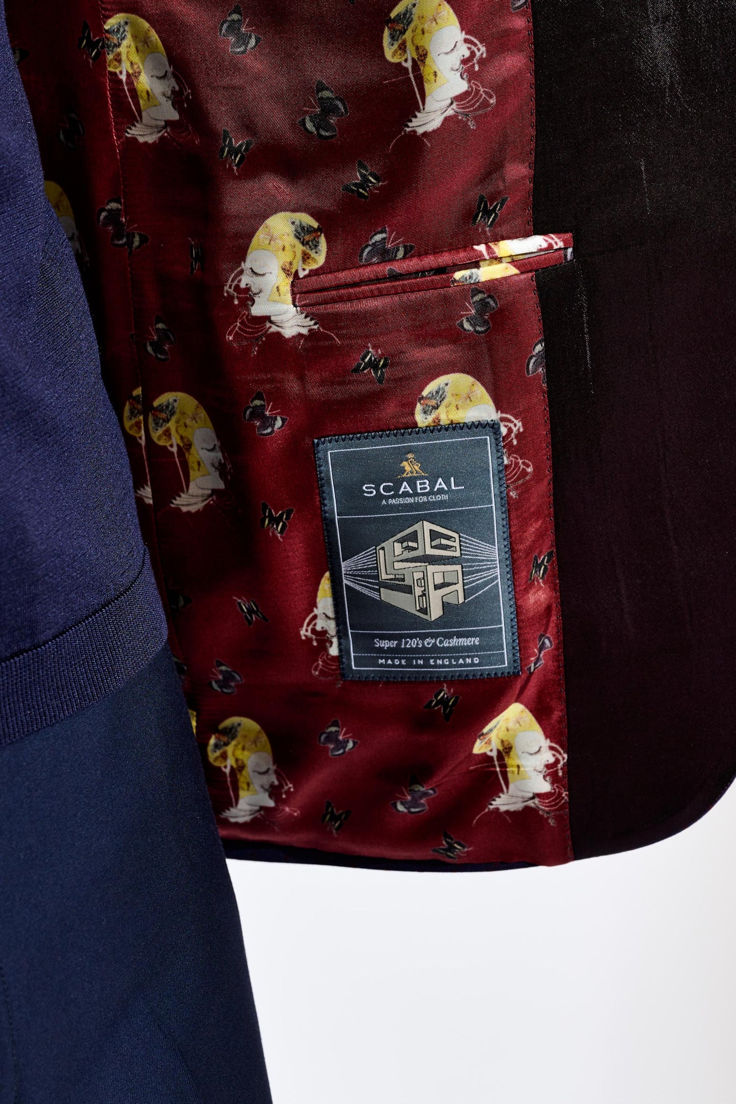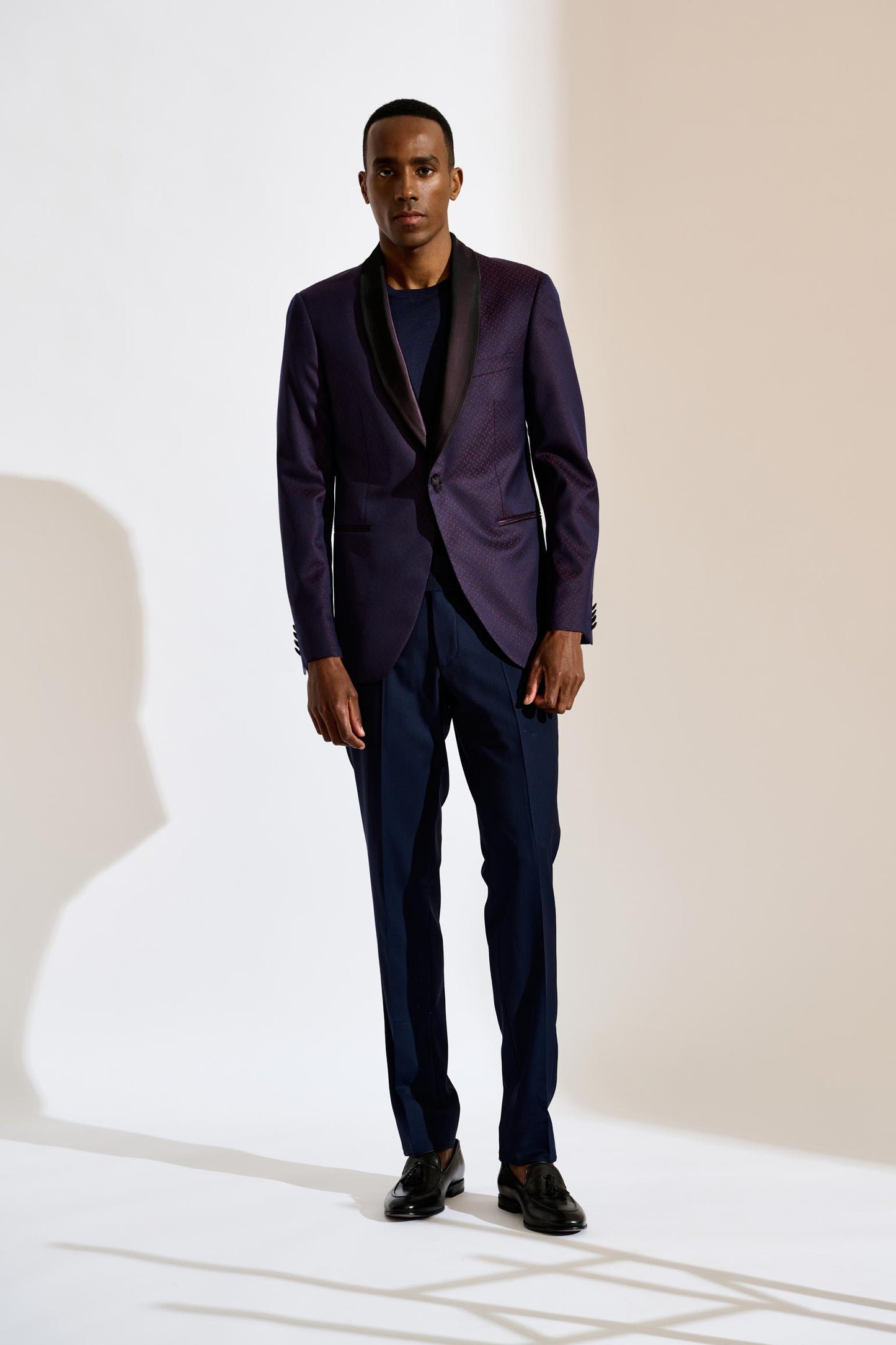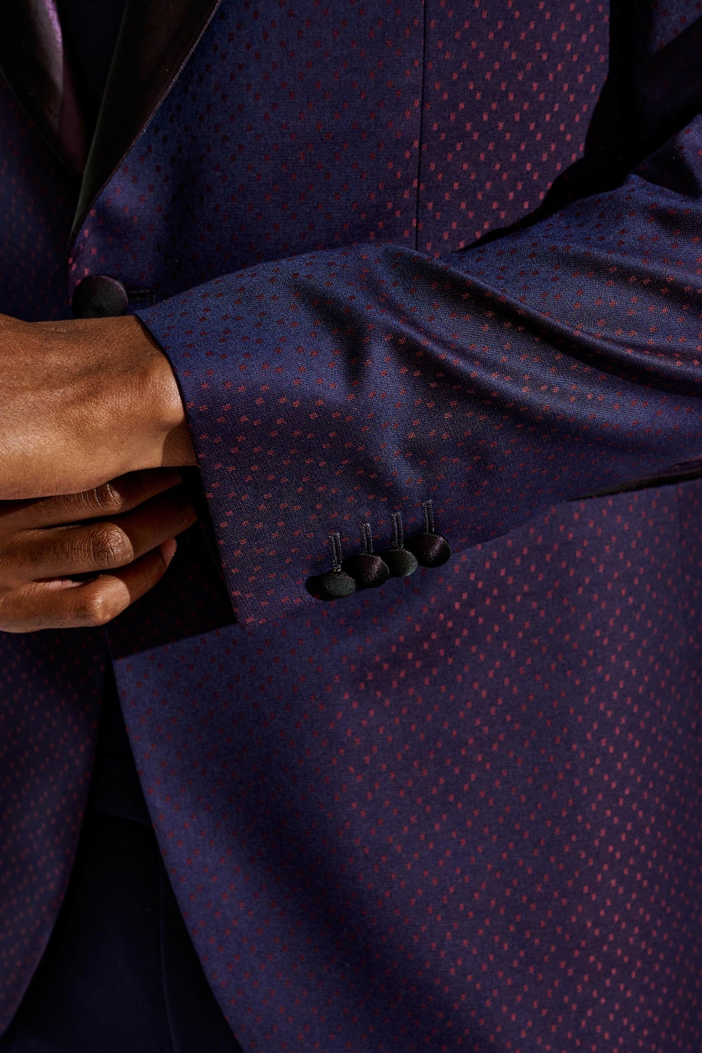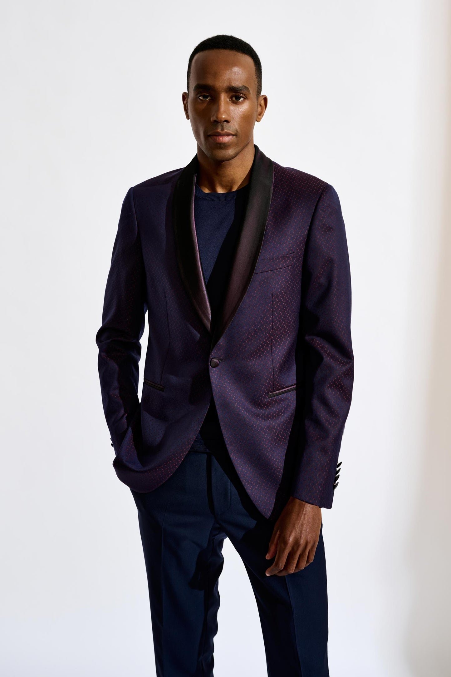 Inspiriert durch das charakteristische Rote Geböude in Lettland, reproduziert das Design das zuföllige Muster der Fenster. Die satten Farben und der sanfte Glanz des Stoffes haben uns dazu inspiriert, einen Smoking mit Schalkragen und passenden Revers aus changierendem Satin zu kreieren, der ein modernes Gefühl vermittelt. Die Jacke wurde mit dem ikonischen Scabal Dali Lining in passendem Burgunderrot gefüttert.