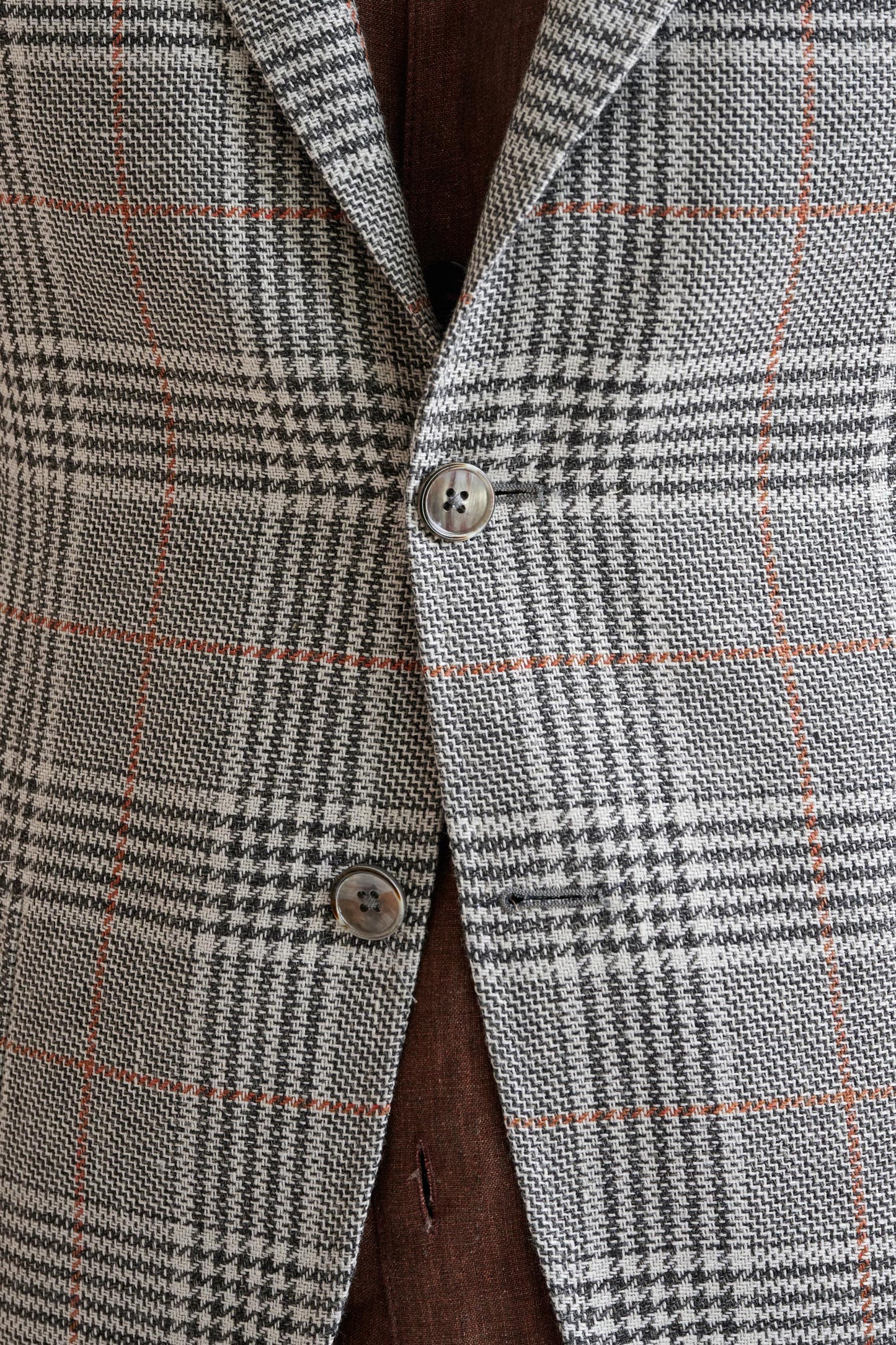 Das hellgraue Karomuster aus Wolle & Die Leinen-Kenton-Jacke Amalfi Trend ist eine moderne Jacke, die durch ihre superleichte Konstruktion Eleganz neu definiert. Es verfügt über ein weiches Schulterdesign ohne Polsterung oder Rollino und bietet unvergleichlichen Komfort und Bewegungsfreiheit.