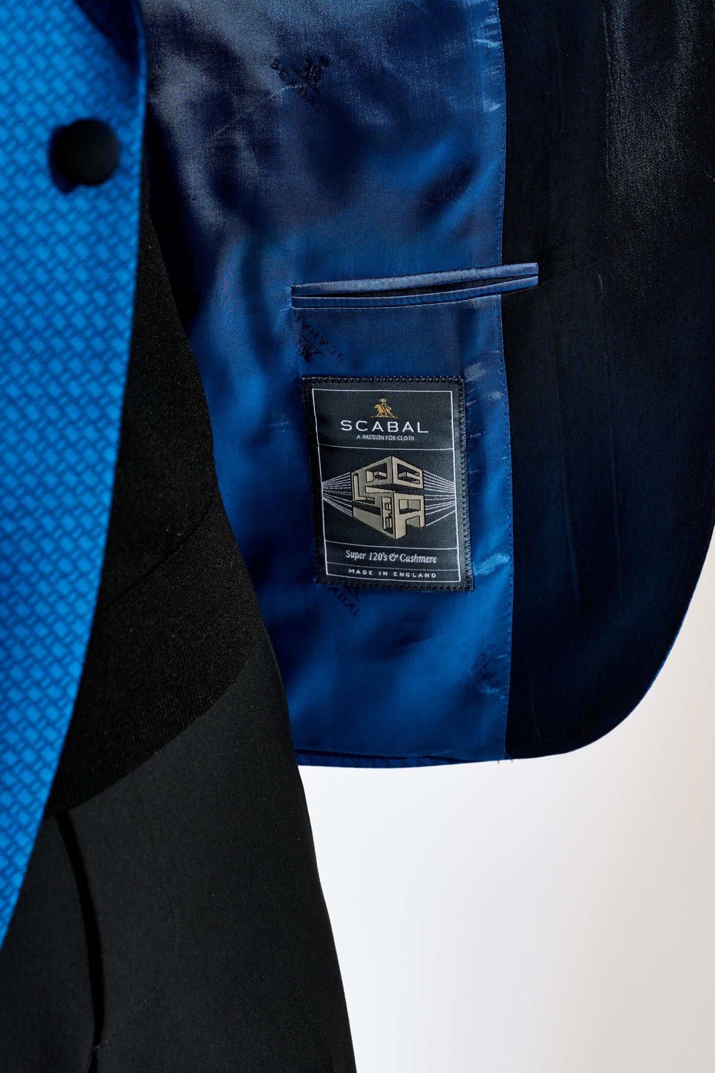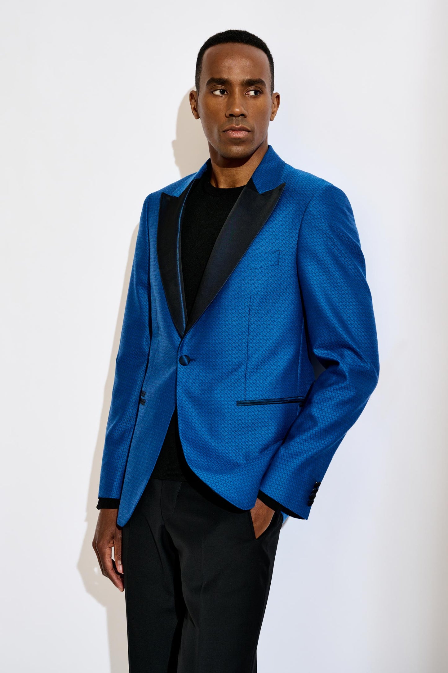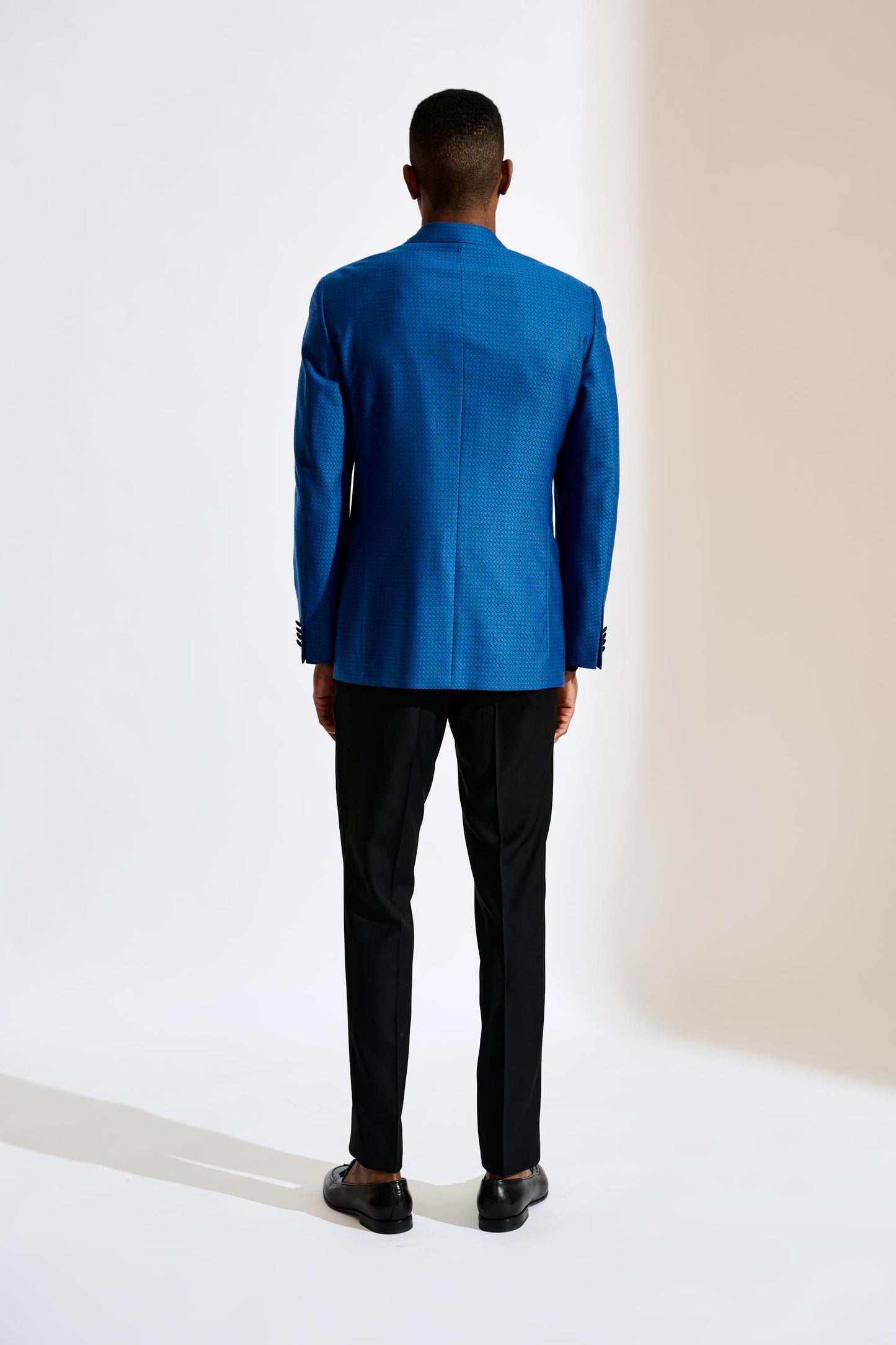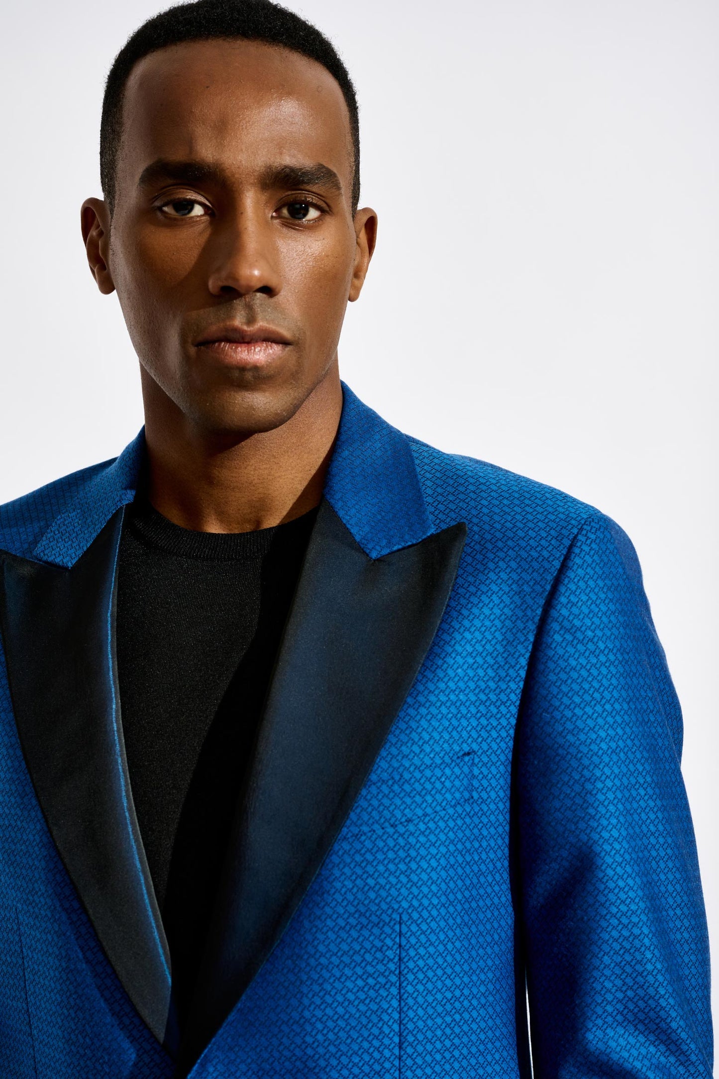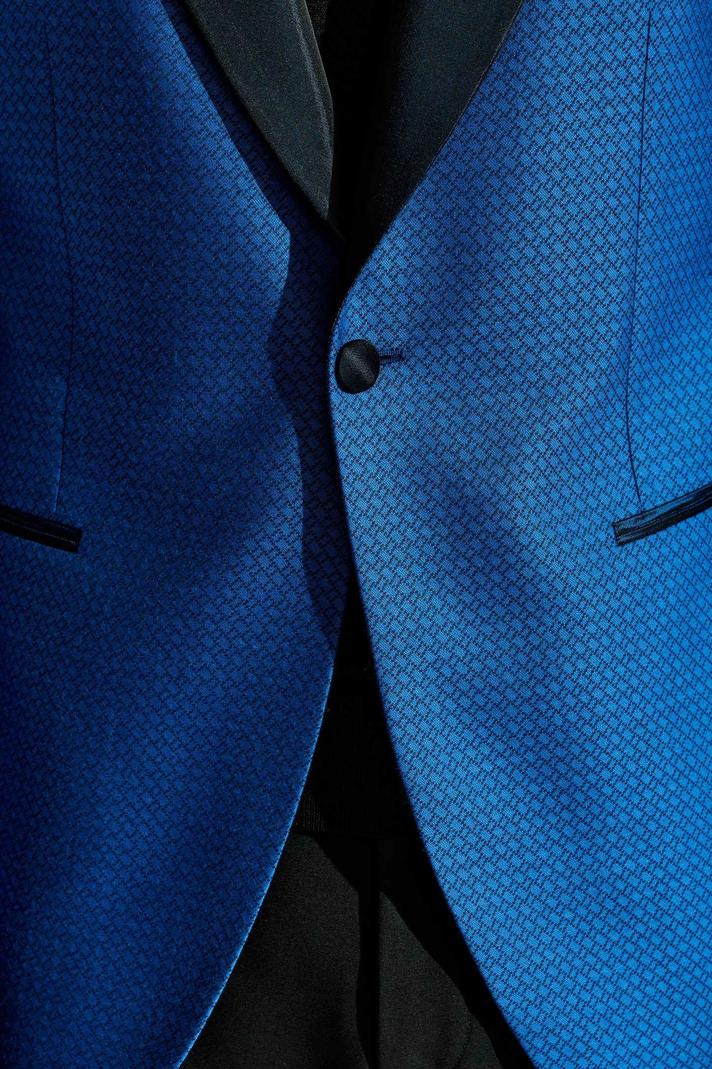 Inspirado en la Torre Merdeka 118 de Kuala Lumpur, el diseño se basa en los patrones irregulares de los cristales de las ventanas del rascacielos. El llamativo azul se basa en el cielo de Malasia y en cómo se refleja en el cristal del edificio. Creada como un esmoquin, esta chaqueta tiene una parte de la solapa de pico cubierta de un satén tornasolado azul en contraste que le da un aire contemporíneo.