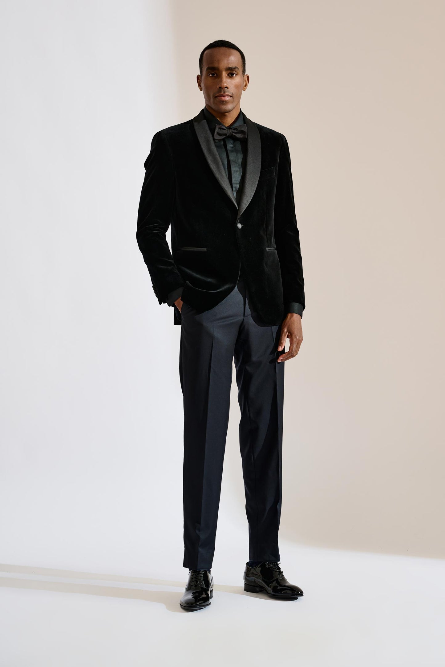 Disfrute de la sofisticación con nuestros lujosos terciopelos de esmoquin negros de Scabal, que rezuman elegancia y tradición con su clísico cuello chal, cierre de un solo botón y discretos bolsillos ribeteados. Meticulosamente confeccionada con los mejores tejidos de Scabal de la icónica colección Velvets, esta prenda de inversión es perfecta para todas las ocasiones formales. Eleve su estilo con un conjunto refinado que trasciende las tendencias y se erige como un símbolo atemporal de un gusto exquisito.