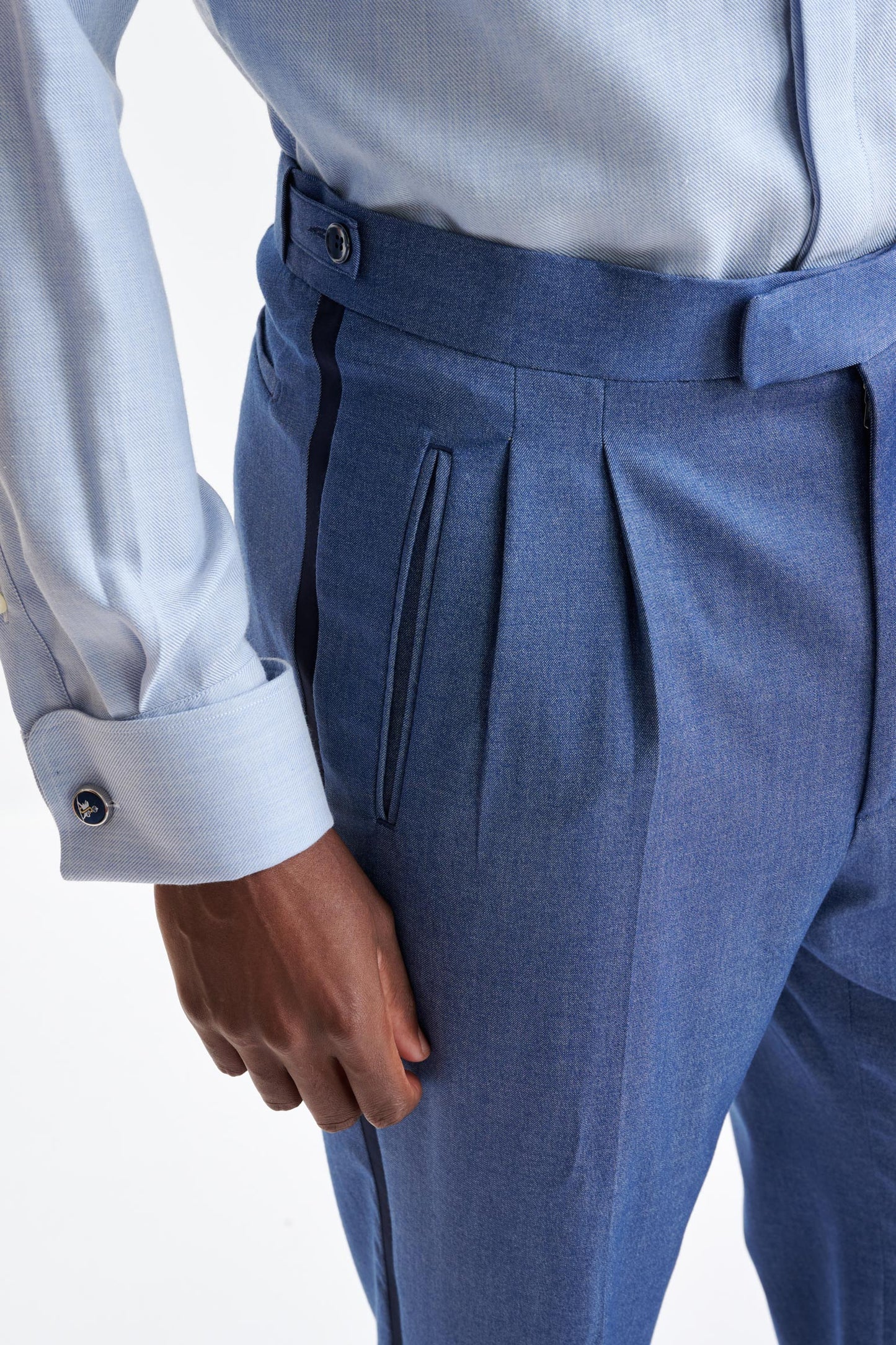 Meticulosamente elaborado con precisión y pasión, el pantalón Farley azul vaquero Cashmere Cotton de Scabal presenta una combinación de tejido de cachemira y algodón que ofrece un estilo atemporal, una comodidad sin igual y un uso diario sin esfuerzo.
