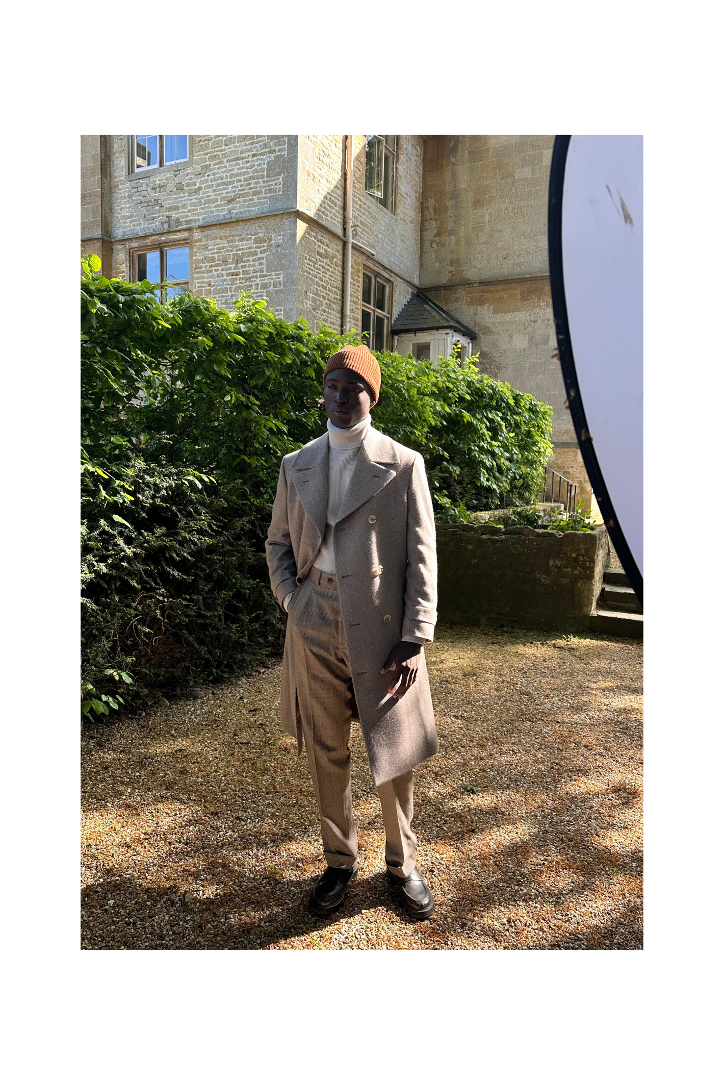 De campagne, gefotografeerd door Mark Sanders en met modellen Guy Robinson en Edge 22, legt momenten van reflectie, voorbereiding en beheerste beweging vast. Binnen bij het haardvuur, buiten in de frisse tuinhaven of klaar voor vertrek naar de stad – elke look vertelt een verhaal van bewuste stijl.