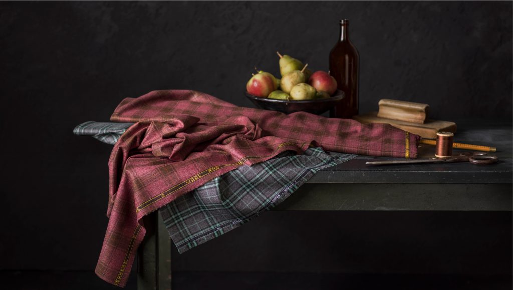 Beginnend met Johannes Vermeer, stelt Scabal zich voor hoe de Nederlandse meester zou kunnen zijn hebben zijn moedertaal – verf – gebruikt om de onze te vertegenwoordigen: stof. Fijne tinten en speelse schaduwen vormen de Autumn Leaves-collectie van Scabal in een klassiek stilleven, compleet met fruitschaal, wijnfles en kleermakersdraad en schaar.