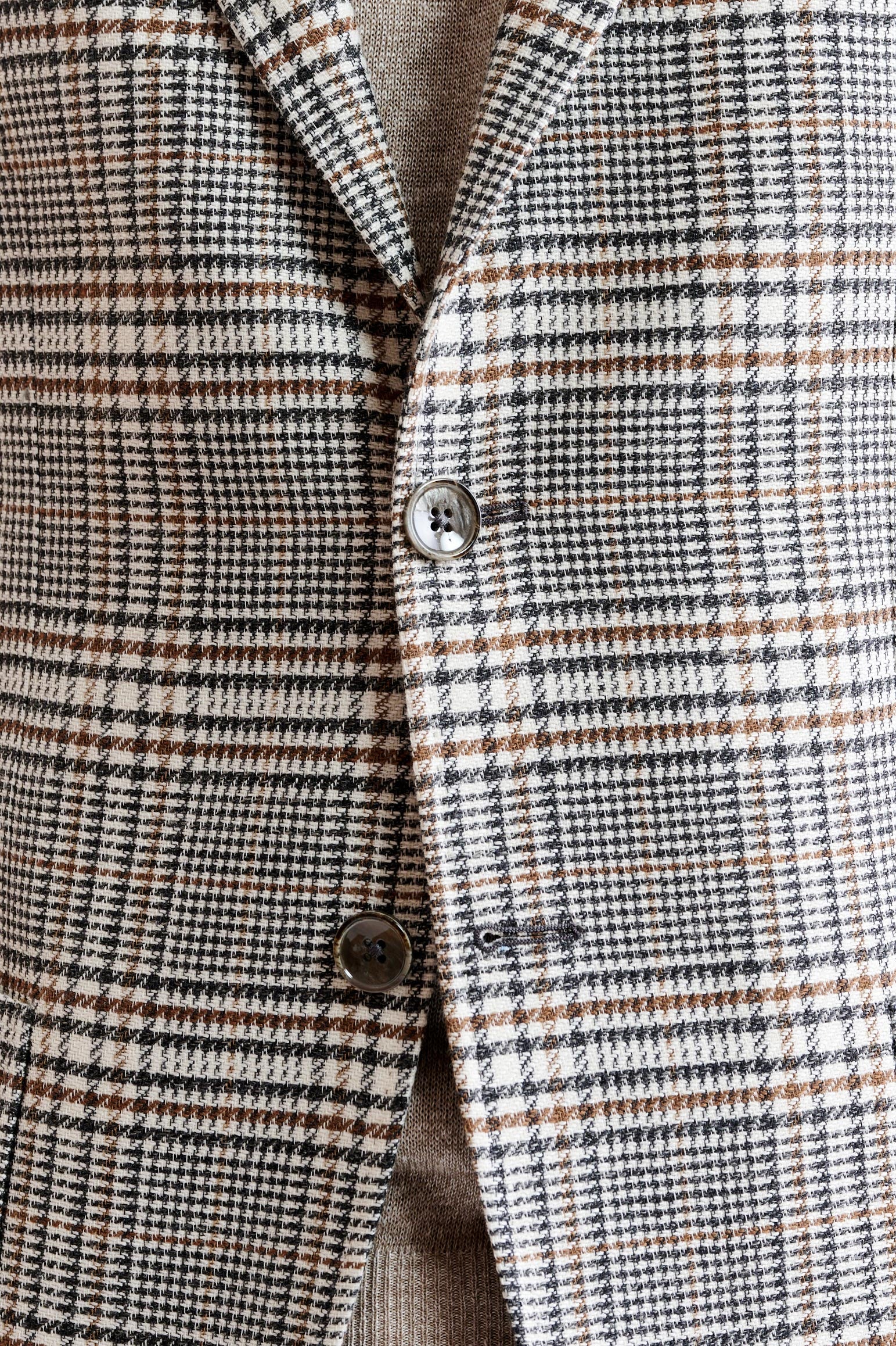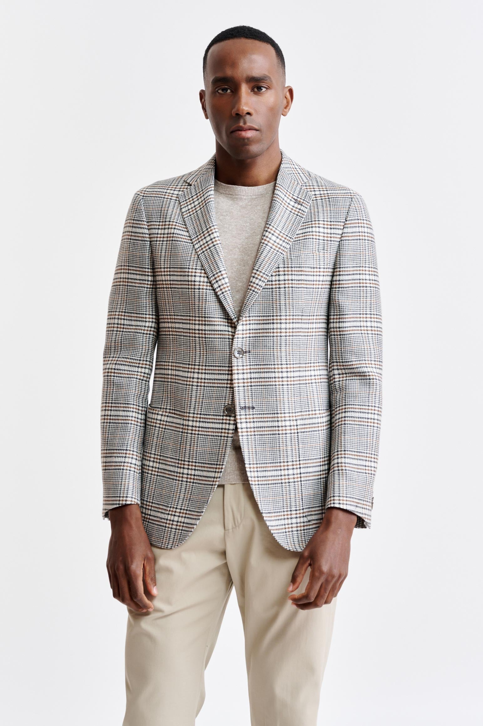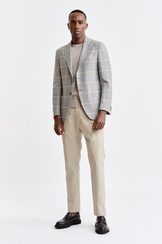 Het Lichtgrijs Wollen En Linnen Kenton-jasje Riviera Trend combineert de ontspannen elegantie van de Italiaanse kust met een eigentijds, ultralicht silhouet. De gestructureerde, linnenrijke stof combineert zelfverzekerde ruitjes met opvallende pied-de-poule-ontwerpen, verrijkt met een palet van oceaanblauw en levendige zomerse accenten voor een moderne kijk op klassieke patronen.
