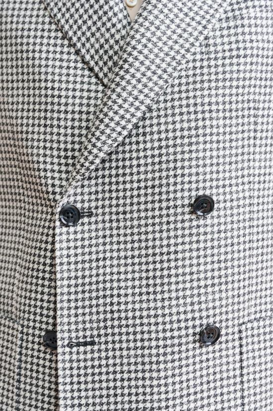 The Black-White Wool & Linen Soho Jacket Riviera Trend blends the relaxed elegance of the Italian coast with the contemporary refinement of the Soho silhouette. Its linen-rich textured weave showcases confident checks and bold houndstooth motifs in oceanic blues, lifted by vibrant summer accents. Finished with a relaxed notch lapel and meticulously crafted in our own workshop, it delivers an effortless balance of modern style, comfort, and elevated sophistication.