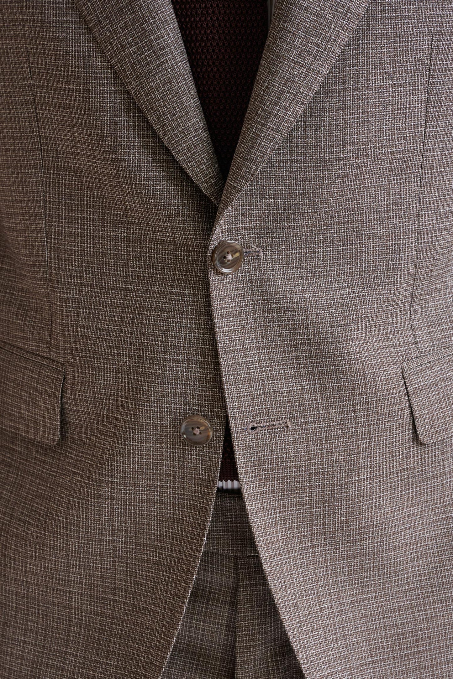Discover the epitome of luxury with our meticulously crafted Scabal Brown White Wool Soho Suit Lifestyle featuring a 100% wool weaving. Made from the finest Scabal fabrics in our own workshop, this suit effortlessly blends timeless elegance with contemporary style.