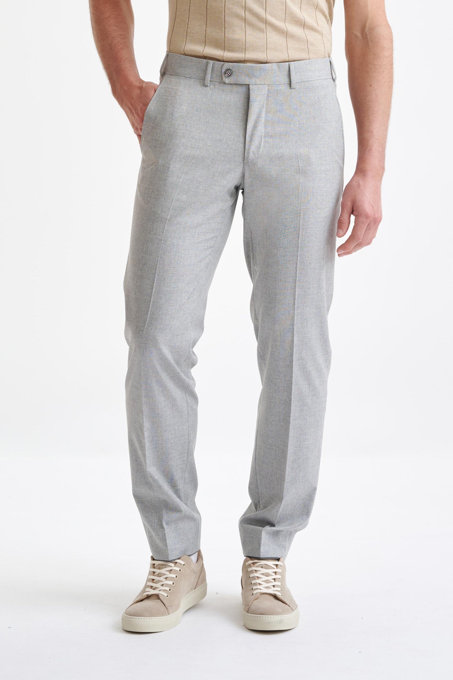 Meticulously crafted with precision and passion, the Scabal Light Grey Wool & Cotton Farley Trousers Lifestyle features a combination of wool, cotton and silk weaving, offering timeless style, unparalleled comfort, and effortless everyday wear.