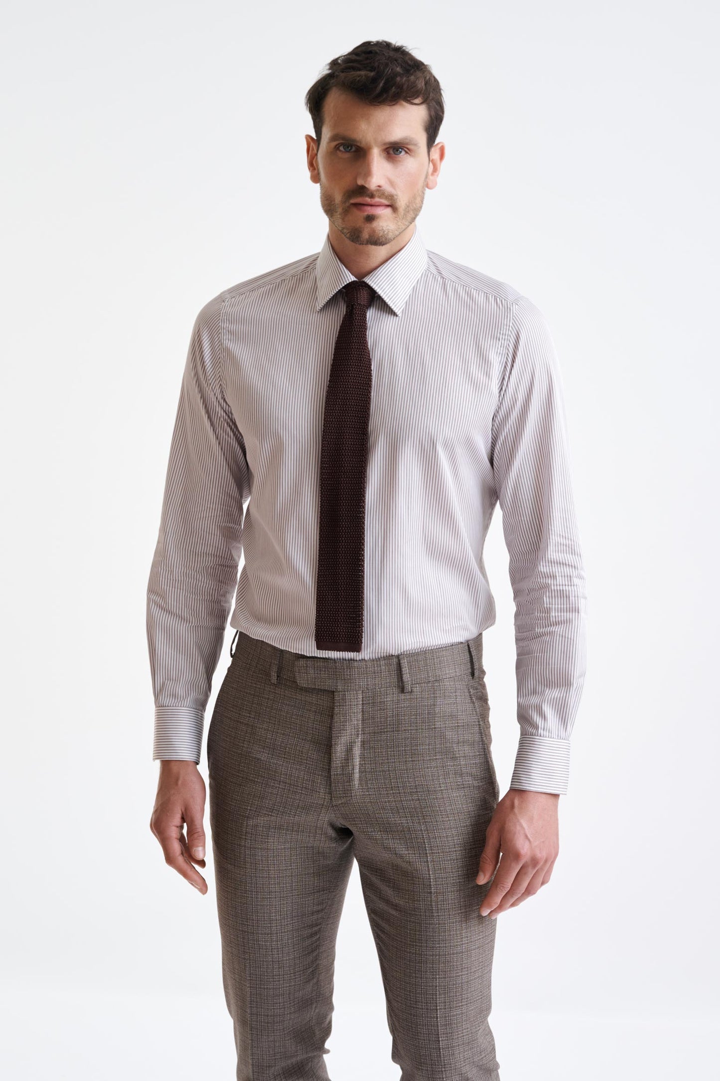 Indulge in opulence with our Scabal Striped White & Brown 100% Cotton Herringbone Formal Shirt, features a combination of cotton and linen weave. Made in Europe to the highest standards of quality, these shirts embody sophistication and comfort.